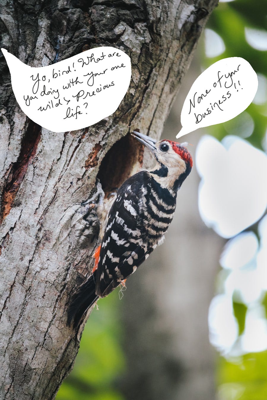 We humans are so full of our own importance, but what if we could just exist along with everything? What if I’m not so completely different from a blade of grass? When I picture myself floating among the stars, I feel peaceful, because I feel simply a part of things. Floating gently through space. Alive and thinking, but also just existing. Weightless. Out from under the pressure to Be Important. What if I can melt into this feeling of belonging more often? Is it possible to believe in the beauty of mere existence? I do not require the woodpecker outside my window to do anything but exist as it is created with its “One wild and precious life.” *